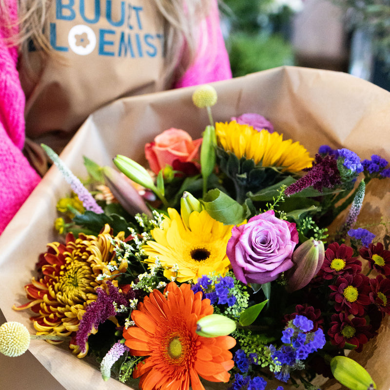 De lokale bloemist schikt jouw boeket met de mooiste verse veilingbloemen en bezorgt de bloemen aan de deur.