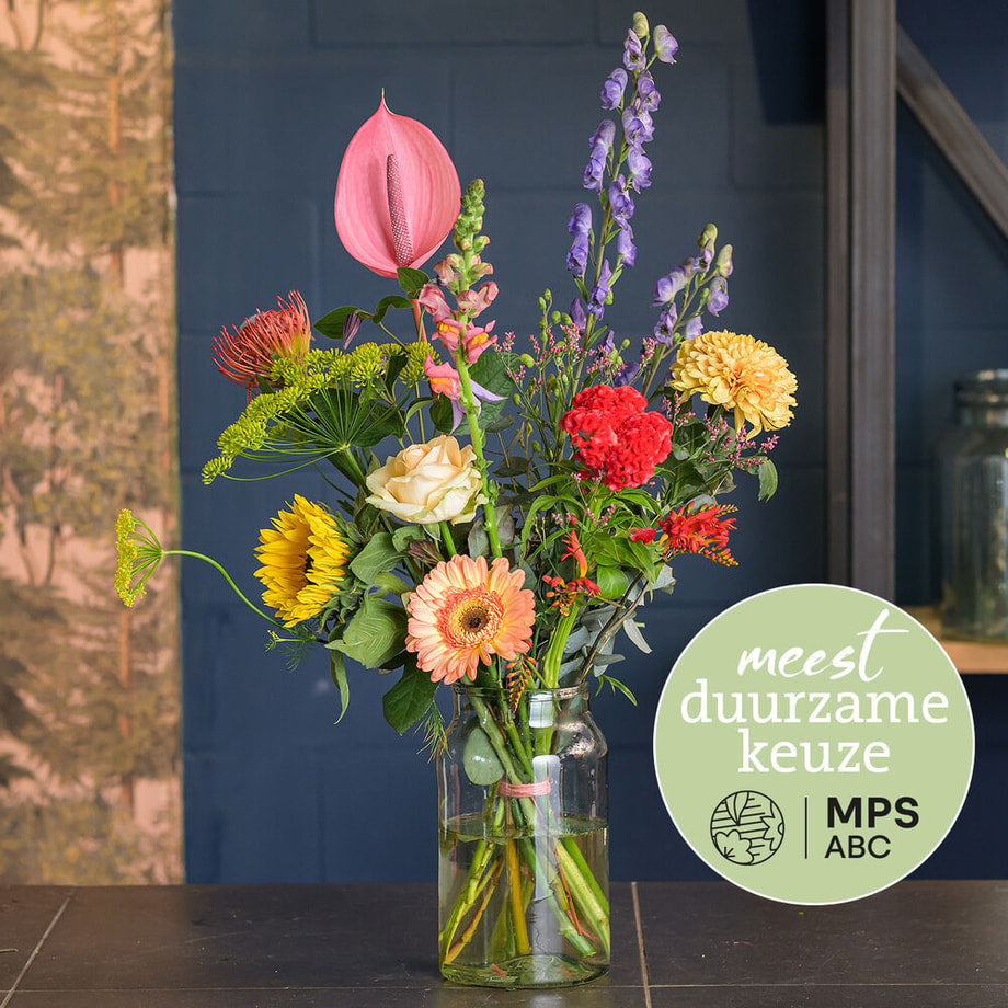 De lokale bloemist schikt jouw boeket met de mooiste verse veilingbloemen en bezorgt de bloemen aan de deur.