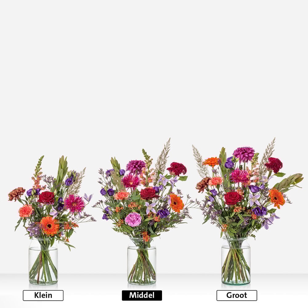 De bij het boeket getoonde afbeelding is overigens altijd de ‘middel’ variant van het boeket. Kleine boeketten zijn – jawel – iets kleiner, terwijl grote boeketten nog rijker en voller geschikt zijn dan op de afbeelding.