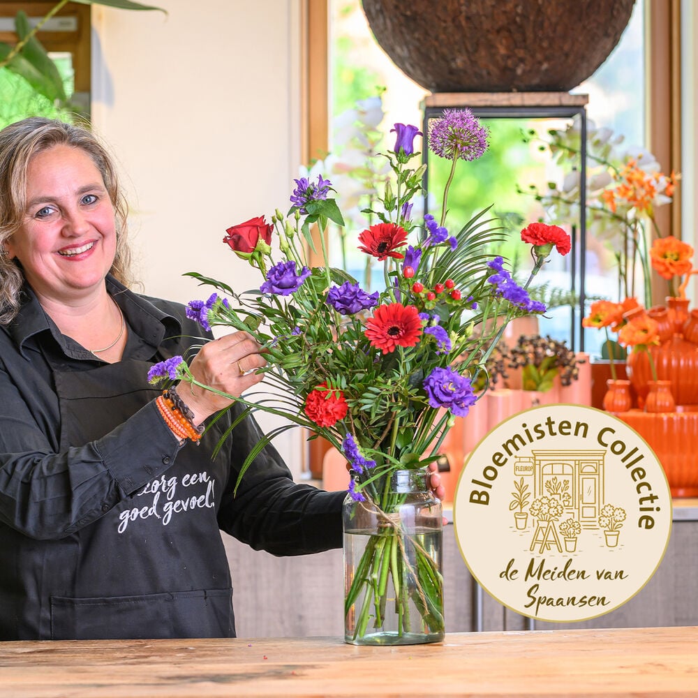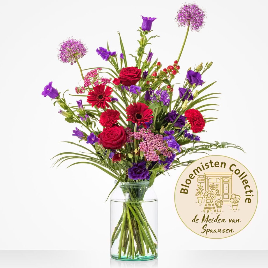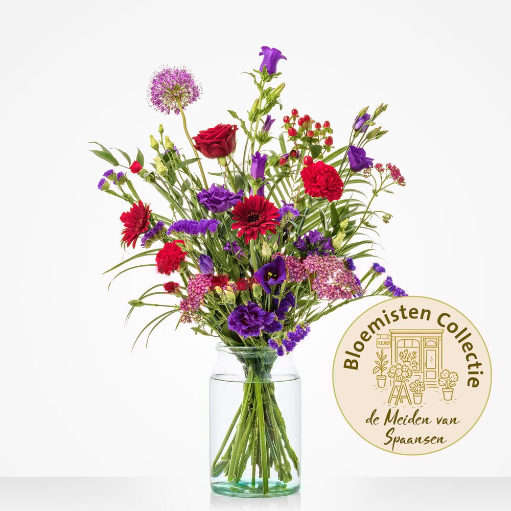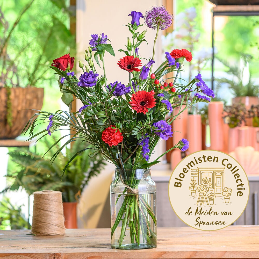 Wat een krachtige combinatie! Het Marina boeket is een speels veldboeket waarin diep paars en knalrood de hoofdrol spelen. Gerbera's, rozen, liatris, allium en clematis dansen in verschillende hoogtes door elkaar heen voor een luchtig en dynamisch geheel. Dit contrastrijke boeket is perfect voor iemand met een sterke persoonlijkheid, of voor jezelf als je van bloemen houdt die niet over het hoofd gezien worden. Een statement in een vaas!