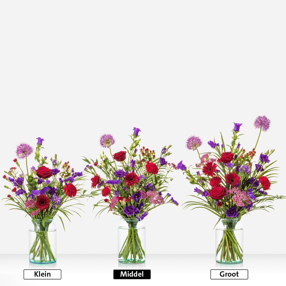 De bij het boeket getoonde afbeelding is overigens altijd de ‘middel’ variant van het boeket. Kleine boeketten zijn – jawel – iets kleiner, terwijl grote boeketten nog rijker en voller geschikt zijn dan op de afbeelding.
