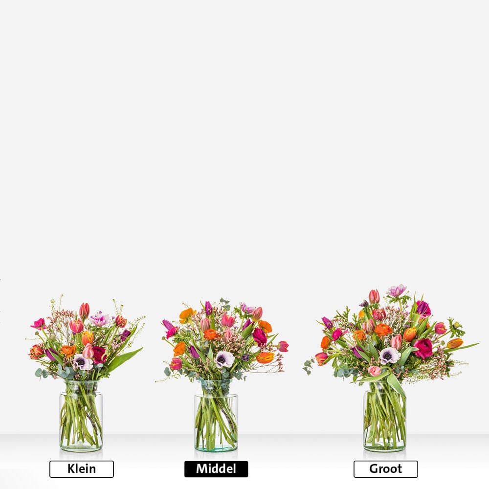 De bij het boeket getoonde afbeelding is overigens altijd de ‘middel’ variant van het boeket. Kleine boeketten zijn – jawel – iets kleiner, terwijl grote boeketten nog rijker en voller geschikt zijn dan op de afbeelding.