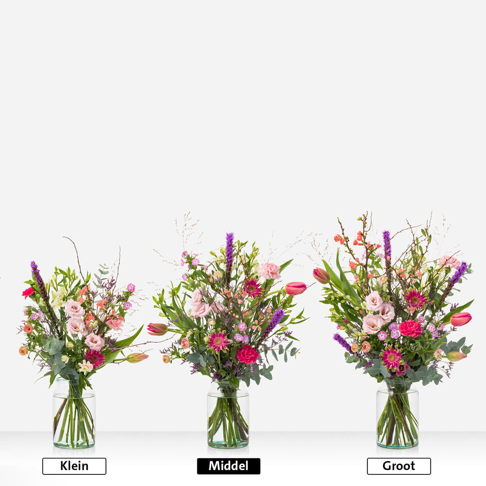 De bij het boeket getoonde afbeelding is overigens altijd de ‘middel’ variant van het boeket. Kleine boeketten zijn – jawel – iets kleiner, terwijl grote boeketten nog rijker en voller geschikt zijn dan op de afbeelding.